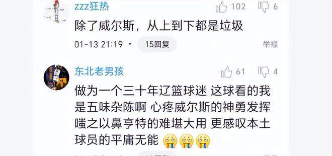 12人上场,只有一人得分上双,这样的表现让辽宁球迷十分不满。他们说除了威尔斯都是垃圾。还有一位老球迷说,“做为一个三十年辽篮球迷这球看的我是五味杂陈啊,心疼威尔斯的神勇发挥,嗤之以鼻亨特的难堪大用,更感叹本土球员的平庸无能。”他们怒批“姜星宇来到辽宁后水土不服,表现一言难尽”,还喷王岚嵚的数据配不上他的丰厚收入。这两个首发今天真的太拉胯,也怪不得被球迷吐槽。对此,你们有什么评论?