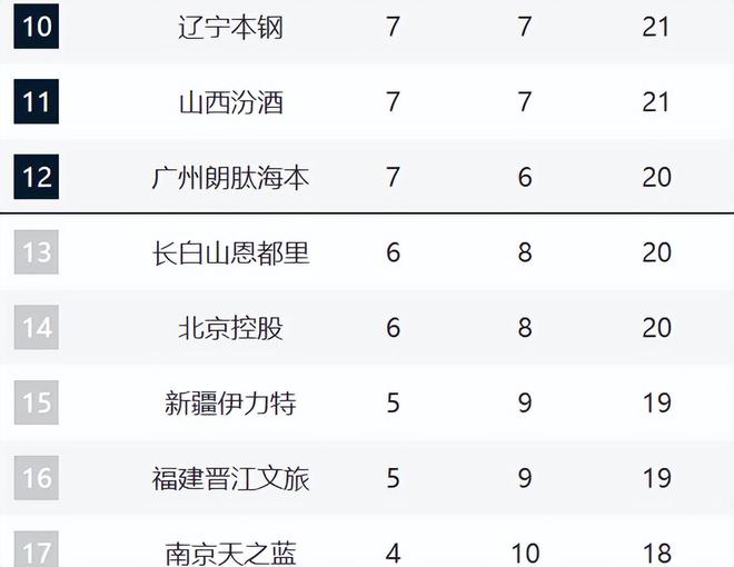 辽宁、山西、广州排在10-12。现在辽宁和山西都是两连败,排名持续下滑。辽宁是因为阵容实力下滑,进攻端很难有人站出来。山西则是因为潘江的执教问题,现在攻守全部出现问题。广州这轮输给天津,现在他们的战绩逐渐下跌了。