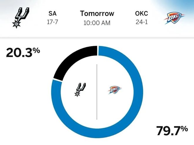 被问及是否特意挑打雷霆复出时?文班亚马表示:“并非因比赛重要,纯属巧合而已,自己每场都在请战。” 话说ESPN并不看好拥有文班亚马的马刺,可以战胜几乎不可击败的雷霆,两队胜率预测如下:
