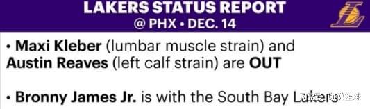 果然湖人战太阳前,就遇到了严峻考验,两名轮换会因伤缺阵。其中奥斯汀-里夫斯这个赛季,已经成为湖人二当家,但他因为小腿受伤,会至少缺阵一周。内线轮换克勒贝尔干脆是老脆皮了,他同样无法出场,此外就是布朗尼,被湖人下放到发展联盟,会跟随小号队伍征战了。