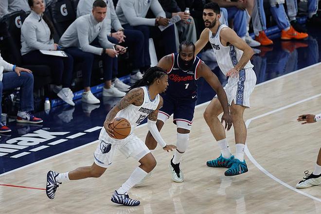 比赛中。图源:视觉中国 本场比赛,快船整体低迷,进攻效率不高,主将哈登带伤出战,得到13分3板6助,另一名主将莱昂纳德则拿到21分,灰熊赢球的同时也送快船近10场比赛里的第9场败仗。 |