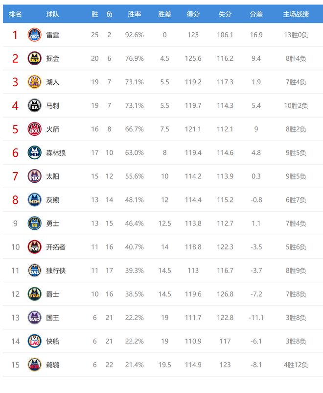 北京时间2025年12月19日,今日NBA有12场比赛,湖人、勇士、火箭、快船、掘金、雷霆、马刺、独行侠、开拓者、国王、鹈鹕、爵士参与其中,赛后西部排名发生了变化。 雷霆主场迎战快船,雷霆缺少了哈滕,快船缺少了哈登、比尔、琼斯,快船先声夺人,首节压制雷霆,一度领先11分,首节战罢领先6分,第二节雷霆强势反弹,单节赢了15分反超9分,下半场比赛雷霆迅速扩大优势,分差一度来到25分,最终雷霆以21分优势大胜快船。亚历山大24中13得到32分7板6助2断2帽,切特13中8(三分5中3)得到22分7板2助,杰伦14中8得到20分5助2断,快船方面伦纳德17中9得到22分8板6助,科林斯13中7得到20分4板2助。