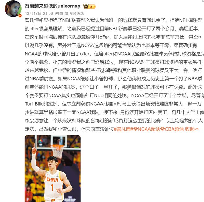 在昨晚,欧洲篮球专家王健就详细的为球迷分析了曾凡博的去处:实际上只有北京首钢一支球队。 曾凡博拒绝了伊拉瓦拉老鹰的合同容易理解,NBL新赛季已经开打两个多月,赛程接近半程,这个时间球队给你开合同也不会给予核心地位甚至登场的机会都很低。 曾凡博去NCAA打球的概率也几乎为0,曾凡博是打过NBA季前赛的球员,如果NCAA让一个打过NBA季前赛的球员重返大学打球,一旦这个口子开了,那么更多的美国球员就会效仿,明显不太可能。 所以王健老师给出的结论就是曾凡博只能回到CBA,回CBA就等于是必然重返北京首钢男篮。