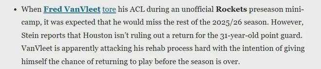 好消息。 名记Stein:火箭目前没有完全排除范弗利特本赛季复出的可能性。