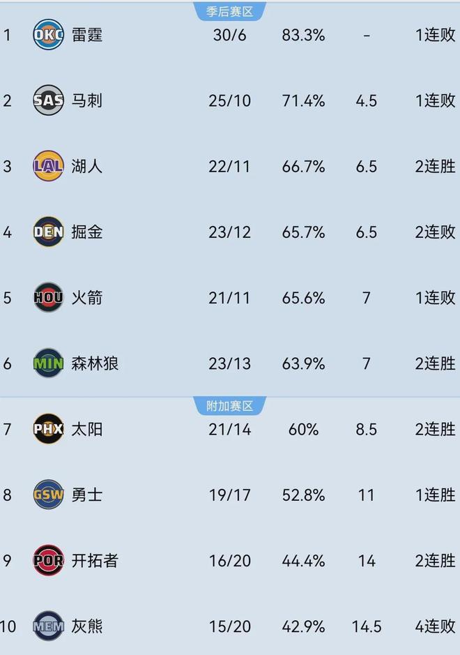 当前西部前三甲分别是30胜6负的雷霆、25胜10负的马刺,以及22胜11负的湖人,遭遇严重伤病潮的掘金则以23胜12负位列西部第四。