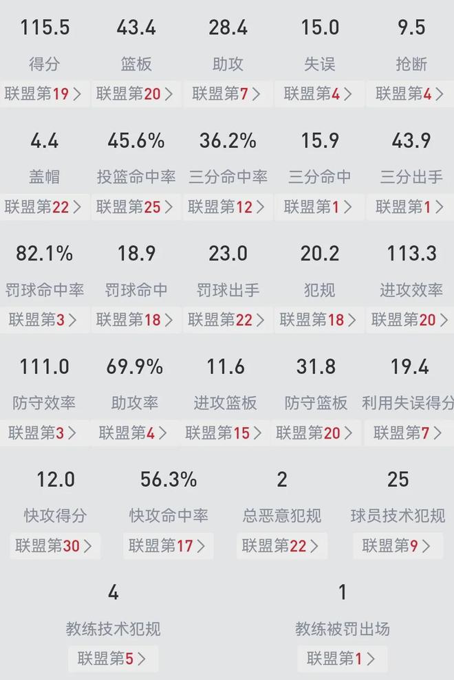 目前为止,勇士以21胜18负排在西部第八,场均得分115.5联盟第19,进攻效率113.3第20,场均三分出手(43.9)和命中数(15.9)均高居榜首,防守效率111.0第三,篮板43.4第20等等。