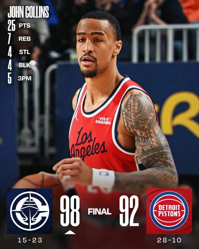 科林斯的爆发,恰逢快船整体战绩的强势反弹。在他打出高光表现的这段时期,快船在最近11场比赛中豪取9胜2负,胜率远超赛季平均。球队排名也从西部下游一路攀升至第11位,距离附加赛区仅一步之遥。
