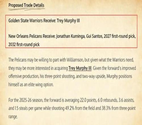 美媒《Fadeaway Wolrd》撰文建议,勇士应该将库明加、桑托斯、2027年以及2032年的首轮签送到鹈鹕,换回墨菲。 墨菲是2021年的首轮17号秀,新秀赛季,他场均只能得到5.4分2.4篮板,但经过5年历练,稳步提升,本赛季他的场均数据已经达到22分6篮板3.6助攻,整体命中率49%,外线命中率38%,场均可以投进3.1记三分球。