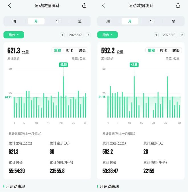 虽然没有系统化训练,但时刻关注身体信号,不强迫则是她的跑步科学:状态好则快,但也就5分半的配速;感觉累则慢,配速6分多也是常事。她也曾尝试过间歇跑,然而跑了一次之后,她就觉得太累了,自己完全不能承受,自此,她也再也没跑过间歇。即便如此,一个月下来,叶瑞也累积了五百多公里的跑量——于她而言,这从来不是一个需要完成的“目标”,而是习惯成自然。
