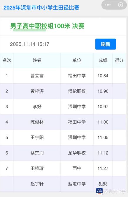 全运会激战正酣,另一场体育盛宴也拉开帷幕。11 月 14 日—16日,深圳市中小学生田径比赛在深圳市第七高级中学举行。为期三天的赛事中,最受瞩目的男子高中职校组 100 米决赛于首日下午上演巅峰对决。福田中学高二学生曹立言以 10 秒 84 的成绩率先冲线,与博伦职校黄梓涛(10 秒 96)、深圳中学李好(10 秒 97)一同打破 11 秒大关,点燃了赛场的激情。