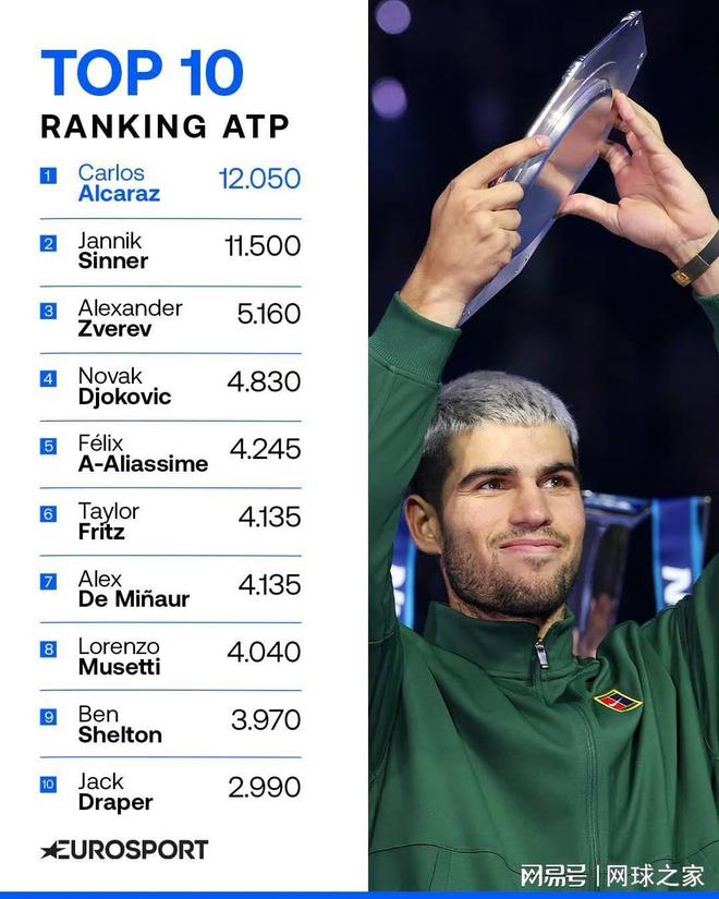 随着年终总决赛的落幕,也标志着本赛季的巡回赛事已经全部结束。在受关注的年终前十球员中,我们不妨细数一下今年和去年相比,谁进入了前十,谁又跌出了前十。 今年ATP年终前十(和去年对比)的排位如下: 1、阿尔卡拉斯(NO.3) 2、辛纳(NO.1) 3、兹维列夫(NO.2)
