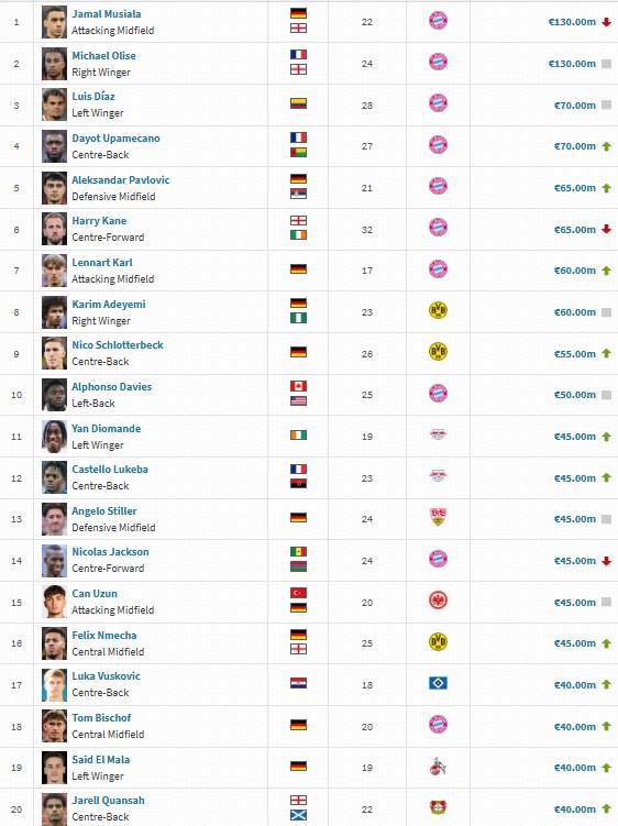 奥利塞(拜仁慕尼黑)1.3亿 穆西亚拉(拜仁慕尼黑)1.3亿 于帕梅卡诺(拜仁慕尼黑)7000万 迪亚斯(拜仁慕尼黑)7000万 凯恩(拜仁慕尼黑)6500万 帕夫洛维奇(拜仁慕尼黑)6500万 卡尔(拜仁慕尼黑)6000万 阿德耶米(多特蒙德)6000万 施洛特贝克(多特蒙德)5500万 戴维斯(拜仁慕尼黑)5000万 迪奥曼德(莱比锡红牛)4500万 卢克巴(莱比锡红牛)4000万 雅克松(拜仁慕尼黑)4500万 乌尊(法兰克福)4500万 恩梅加(多特蒙德)4500万 武什科维奇(汉堡)4000万 比朔夫(拜仁慕尼黑)4000万 马拉(科隆)4000万 夸安萨(勒沃库森)4000万 基米希(拜仁慕尼黑)4000万 拉尔松(法兰克福)4000万 科贝尔(多特蒙德)4000万 吉拉西(多特蒙德)4000万 |