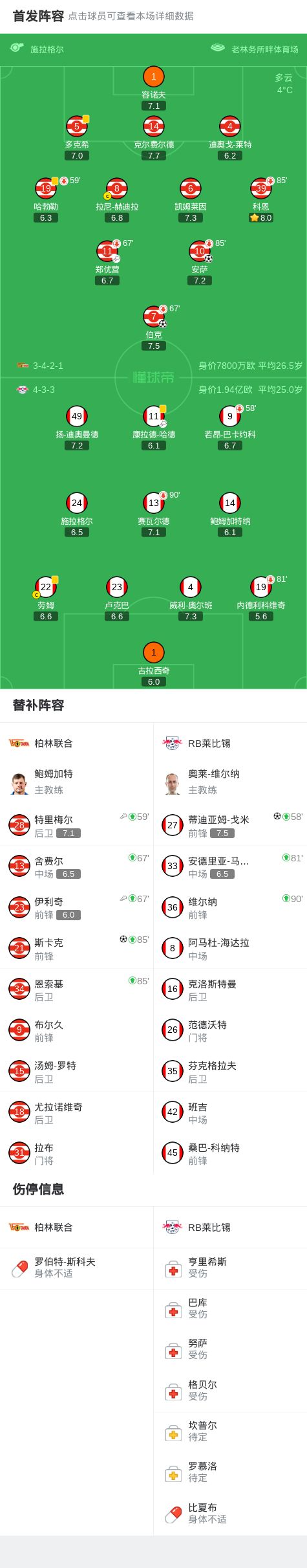 第57分钟,柏林联合球员郑优营助攻伯克打入一球。 第60分钟,RB莱比锡球员康拉德-哈德助攻蒂迪亚姆-戈米打入一球。 第63分钟,柏林联合球员特里梅尔助攻安萨打入一球。 下半场补时第3分钟,柏林联合球员伊利奇助攻斯卡克打入一球。 球队阵容
