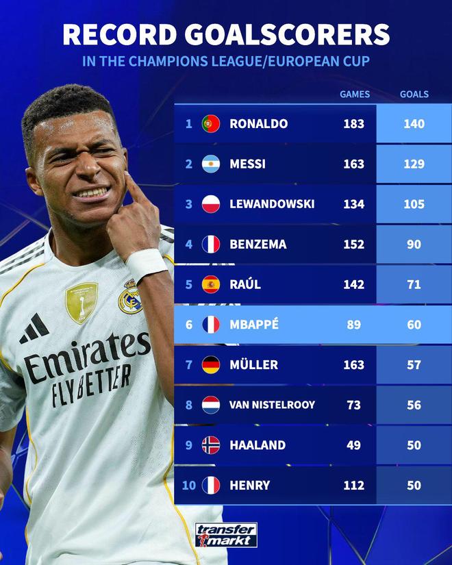 姆巴佩欧冠进球数达60球,超越穆勒居历史第6位