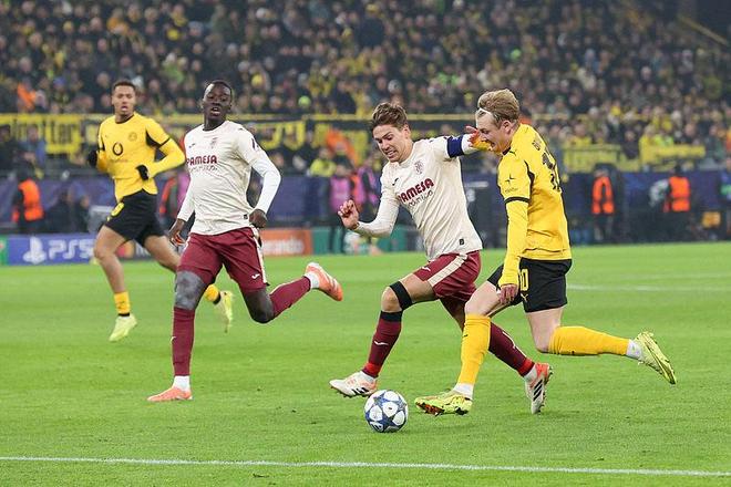 比赛中。图源:视觉中国 第58分钟,阿德耶米的进球,帮助多特蒙德3比0比利亚雷亚尔,全场补时阶段,格罗斯传中,斯文松头球破门,最终多特蒙德4比0完胜比利亚雷亚尔。 |