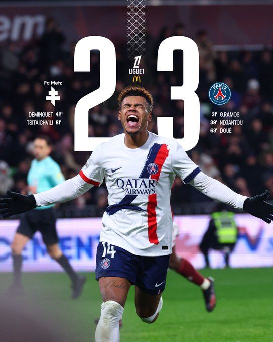北京时间12月14日02:00,法甲联赛第16轮,巴黎圣日耳曼做客挑战梅斯。上半场,贡萨洛·拉莫斯首开纪录,恩贾恩图扩大领先优势,德曼盖扳回一城。巴黎半场2-1领先梅斯。下半场,替补登场的杜埃打进一球,齐塔伊什维利破门。最终巴黎3-2击败梅斯,取得联赛两连胜,暂升至积分榜榜首。