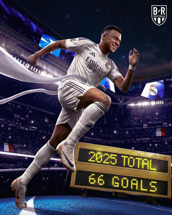 追平C罗的皇马队史单年度进球纪录之余,姆巴佩也创造了个人年度进球新纪录。2025年他在皇马59场攻入59球,是职业生涯俱乐部新的年度进球纪录。加上国家队的7球,今年姆巴佩66场攻入66球,领先凯恩7球,哈兰德9球。虽然两人都有1场比赛才结束2025年,但要超越姆巴佩难度太大。