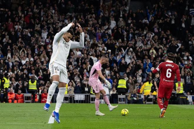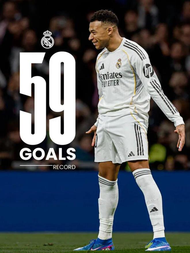 此役上半场第38分钟贝林厄姆为皇马打破僵局,下半场第86分钟姆巴佩主罚点球锁定胜局。进球后姆巴佩做出C罗招牌式庆祝动作,向偶像致敬。此球是2025年姆巴佩在皇马的第59球,追平C罗的皇马队史单年度进球纪录(2013年),这对姆巴佩而言是有里程碑意义的纪录。虽然皇马单年度进球纪录不会有任何奖项,但将永载皇马史册。
