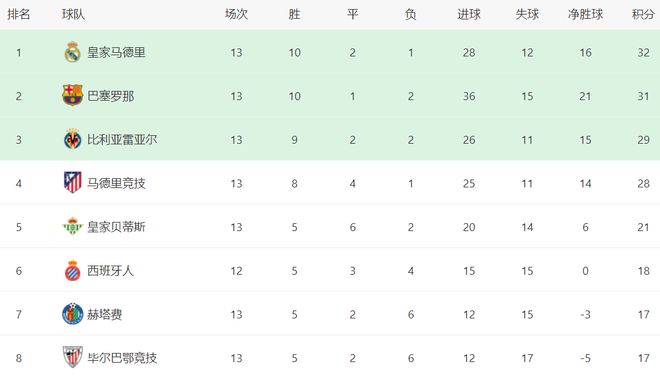 在积分榜上,皇马以32分重登榜首位置。只是皇马的优势很小,只领先身后的巴萨1分。比利亚雷亚尔以29分排名第3。第4的马竞拿到28分。前4差距最多只有4分,冠军的争夺还是很激烈的。第5名的是皇家贝蒂斯,只拿到21分,要想杀入欧冠区有点困难。西班牙人以18分排名第6。 |