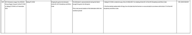 亚足联官方表示,北京国安与河内公安的行为损害了赛事声誉。(此为双方在累犯期内的第二次违规)北京国安足球俱乐部(中国)、河内公安足球俱乐部(越南) 因违反《亚足联纪律与道德准则》第50.1条,被处以6250美元罚款。 罚款须依照《亚足联纪律与道德准则》第11.3条规定,自本处罚决定送达之日起30日内缴清。