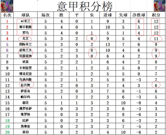 积分榜方面,本轮结束后已经没有全胜球队,AC米兰终止了那不勒斯的4连胜,并以一个净胜球优势超过那不勒斯领跑。全胜球队没有了,但是还有3支保持不败的球队,尤文3胜2平,差AC米兰1分排在第4,亚特兰大和克雷莫纳2胜3平,和国米同分,排在第6,第7。拉齐奥今天大胜止住颓势后,暂时远离降级区,升至第12。