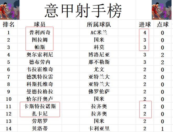 射手榜方面,普利西奇4球领跑,图拉姆,帕斯和奥尔索利尼3球槟榔第2。扎卡尼,卡斯特拉诺斯今天破门后,追上韦拉霍维奇,劳塔罗,恰尔汗奥卢等人,2球刚好挤入前十。