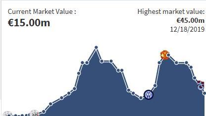 奥纳纳的身价巅峰出现在2019年12月18日,当时他效力于阿贾克斯,身价来到了4500万欧。从国米加盟曼联后,他的身价又迎来了第二次高峰,达到了4000万欧元,不过自那以后,奥纳纳的身价就一路下滑,目前已经来到了1500万欧。 本赛季租借加盟特拉布宗体育后,奥纳纳坐稳了球队首发,一共为球队出场12次,甚至还有1次助攻的数据。 【上咪咕独家看英超】 |