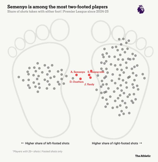 由于他的双脚均衡能力,对手的防守变得更加复杂。如果我们观察自2024-25赛季以来球员的射门脚分布,塞门约可能是联赛中最“双足皆能”的球员。