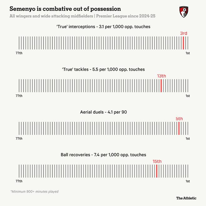 在防守方面,与许多英超顶级边锋相比,他在无球跑动和压迫时的表现也相当出色。作为伊劳拉麾下高位压迫体系的一部分,塞门约更像是一个主动出击型的防守者,旨在从触球过重或靠近己方禁区时未观察周围情况的对手脚下断球。