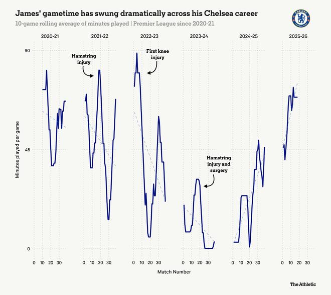 里斯-詹姆斯的2025年点缀着他切尔西生涯的诸多里程碑,而他也将以另一项成就结束这一年。 5月25日,切尔西在詹姆斯担任队长期间首次获得欧冠资格。三天后,他作为队长首度捧起奖杯——切尔西赢得了欧协联冠军;7月13日,他再添一冠,球队在俱乐部世界杯决赛中战胜巴黎圣日耳曼。10月18日,詹姆斯在随队客场对阵诺丁汉森林的比赛中,为自己自幼支持的俱乐部完成了第200次出场。 今晚切尔西主场对阵伯恩茅斯的比赛,将标志另一个里程碑:整整一年无伤病。自2024年11月腿筋受伤后,詹姆斯于12月30日切尔西客场0-2负于伊普斯维奇的比赛中,重返恩佐-马雷斯卡的比赛日名单。除三月一次短暂生病外,此后他的身体状态保持良好。 考虑到伤病如何困扰了这位26岁球员迄今为止的生涯,这无疑是一项巨大成就——球员和俱乐部都值得赞赏。 “他能够持续保持一段无伤病的良好时期,这对他未来而言无疑是一个积极的信号,”物理治疗师卢克-安东尼表示。他未曾与詹姆斯共事,但基于其在沃特福德、雷丁和诺维奇城的工作经验,为The Athletic提供了普遍性见解。 “我认为他最大的不同或许在于,他得以进入(比赛的)连贯节奏,并且拥有了一段适应期,从而培养了那种强韧度。” “可能的情况是,要么他成功建立了训练连贯性并增强了身体力量,要么他改变了自己的方法。” 切尔西在节日期间比赛中的两项数据,凸显了詹姆斯出勤率的提升。 上周六对阵阿斯顿维拉,他完成了2025年的第50次俱乐部出场,这是自2021年以来他自然年出场的最高数字。腿筋和膝盖问题曾尤其困扰詹姆斯,在过去三个完整赛季中,他平均每赛季各项赛事出场22.3次。而本赛季尚余五个月,他已出场22次。 由布莱斯-卡瓦纳领导的俱乐部医疗团队对詹姆斯进行了谨慎管理。切尔西的康复理疗师之一本-麦克唐纳德被指派与詹姆斯紧密合作,专注于其身体状况,两人已建立起良好的默契。 詹姆斯也是切尔西相信其负荷管理方法能取得成效的一个例证。正如The Athletic所报道的,本赛季在医疗和表现团队的引领下,俱乐部实施了精心管理球员上场时间的明确策略。 下图显示了詹姆斯滚动平均的每场比赛出场时间。此前,在他伤愈复出后迅速承受大量负荷时,图表呈现陡降后骤升的曲线。而自一月份回归以来,他的上场时间得到了更为审慎的管理。