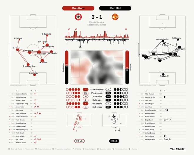 英超第6轮,曼联客场1-3不敌布伦特福德。赛后,TA对曼联新赛季开赛至今的现状进行了报道(主要是批评声音),并表示,曼联的表现照上赛季有所提升,现在更像是一支英超中游球队了。 报道称,当《Hey Jude》的旋律在布伦特福德社区球场回荡时,B费双手叉腰,低垂着头,看起来像是一个正在努力振作精神去做该做的事的人。 最终,他带领他的曼联队友走向聚集了球队支持者——那些留下来的球迷——的角落。他们三三两两地拖着步子走过去,在那些球迷面前站了一分钟左右,神情落寞,鼓掌以示感激,或者是在惨败给布伦特福德后表达歉意。 这种敷衍的仪式如今已经司空见惯。曼联在英超联赛的最近八场客场比赛中只拿到了两分。两周前,他们在曼城输球;而这次又在布伦特福德栽了跟头。10月19日,国际比赛日后的短暂休整将把他们带到卫冕冠军利物浦,而接下来他们还将造访诺丁汉森林、热刺和水晶宫,这一切都将在11月底之前发生。 这些旅程还会带来多少痛苦?曼联还能承受多少打击? 在这场比赛之前,人们热议的话题是:上轮比赛击败切尔西后,曼联是否终于能在阿莫林执教以来首次实现英超连胜。毕竟,自从阿莫林去年从葡萄牙体育接手曼联后,这种情况还从未出现过。 但即便如此讨论,也是对他们的过度恭维。自阿莫林上任以来,他们在33场英超比赛中仅赢下9场。别提连胜,自今年1月以来,他们甚至未能在一个自然月中取得两场英超胜利。 赛后新闻发布会上,有人向阿莫林指出,尽管切尔西那场比赛后带来了乐观情绪,但这不过是“进一步退一步”的情况。 然而,这依然低估了问题的严重性。因为当一名主教练输掉的比赛(17场)几乎是赢球数(9场)的两倍时,更像是“进一步退两步”。而在士气、信念和势头方面,情况更为糟糕,因为像这样一场令人沮丧的失利——其表现之惨淡——所带来的负面影响,远远盖过了击败伯恩利、切尔西或其他任何对手所带来的乐观情绪。 本赛季曼联的表现确实有所提升,但坦率地说,这种提升让他们看起来更像一支中游球队——但有时甚至可能是偏下的中游球队,正如战绩所反映的那样——而不是2024-25赛季那种垫底的队伍。 预期进球(xG)图表显示这支球队正在创造机会,并朝着正确的方向前进,但在阿莫林时代的连贯且令人信服的表现仍然少得可怜。 尽管许多人愿意将本赛季视为一张白纸,但去年此时的阴影依然挥之不去,当时人们还在谈论滕哈格接手后的新开始。那时也偶尔有一些表现让人看到希望,但也有一些比赛让人觉得这支球队永远无法成功。 上个赛季的前六场英超比赛,曼联拿到了7分(2胜1平3负)。而本赛季的前六场英超比赛,他们的战绩完全相同。 目前,老特拉福德内部对阿莫林的不满之声几乎微不可闻,但像这样的表现还能持续多久?这样的轨迹还能维持多久,才会有人开始提出棘手的问题?换句话说,每个月只赢一场英超比赛的情况还能让俱乐部的决策者相信他们走在正确的道路上多久? 前往伦敦西部的路上,随队出征的曼联球迷中弥漫着一定程度的乐观情绪。当首发名单公布时,兴奋的讨论随之而来:三名夏季新援(姆伯莫、库尼亚和谢什科)首次同时出现在锋线上。然而,仅仅20分钟后,曼联就以0-2落后,并被基斯-安德鲁斯麾下的一支布伦特福德队全面压制,这支布伦特福德在新帅的带领下前五场英超比赛仅赢了一场。 “我总是尽可能客观地分析比赛,”阿莫林赛后对记者说道,“今天,我们踢的是布伦特福德的比赛,而不是我们的比赛。当你踢对手的比赛时,最终要赢得比赛会更加困难。我们从未进入长时间控球和掌控比赛的状态。我们始终没有找到感觉。” 这是一个公平的评价。但曼联的比赛风格到底是什么?是控制中场吗?因为无论他们在中场使用什么组合——本场比赛是乌加特搭档费尔南德斯——他们都很难持续亮眼发挥超过10到20分钟。在这场比赛中,他们甚至完全没有做到。这也是为什么在今年夏天球队花费2亿英镑进行大换血的情况下,未能签下一名中场球员显得如此令人费解。 即使在开场阶段,比赛似乎就已经在布伦特福德的节奏中展开。 这不仅是因为阿莫林的球员们多次让自己暴露在角球和界外球的威胁之下,更是因为他们频频在中场人数处于劣势。 安德鲁斯赛后提到“寻找局部人数优势”,并采用“三中场对抗对方双中场”的策略。理论上,阿莫林钟爱的3-4-3阵型应该在场上某处形成人数优势。但实际上,面对训练有素的对手——英超中有许多这样的球队——这种优势很少显现出来。 第一个丢球简直荒谬至极。从库尼亚在对方半场深处丢球的那一刻起,布伦特福德仅用了四次触球便完成了进球。亨德森稳住球后直接送出一记长传,这是这位英格兰中场标志性的打法之一,对手理应对此保持警惕。随后,伊戈尔-蒂亚戈用头将球卸下,随即左脚轰出一记势大力沉的射门,皮球飞入巴因迪尔的近角。 这一丢球的前提是马奎尔的严重判断失误。他试图前压造越位的想法本身并无不妥,但他的判断出现了偏差。虽然只是毫厘之间,但在这种情况下,这种失误足以让对手获得一次直面球门的机会。阿莫林赛后提到本周曾与球员们演练过类似场景,但马奎尔的时机选择显然完全错误。 伊戈尔-蒂亚戈的第二个进球同样是一次防守端的混乱,但这也反映了曼联整体表现的糟糕。几乎每次布伦特福德进攻时