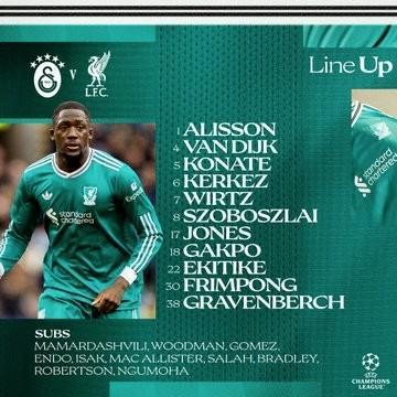北京时间10月1日3:00,欧冠联赛阶段第2轮利物浦客战加拉塔萨雷。双方赛前公布首发名单。 利物浦首发:1-阿利松、4-范戴克、5-科纳特、6-科尔克兹、7-维尔茨、8-索博斯洛伊、17-柯蒂斯-琼斯、18-加克波、22-埃基蒂克、30-弗林蓬、38-赫拉芬贝赫 加拉塔萨雷首发: 【上咪咕独家看英超】 |