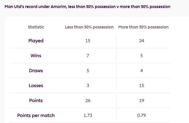 阿莫林:从比赛的前10分钟我就感觉到,我们并没有拿出(与之前比赛)同样的强度。 抛开结果不谈,我们的比赛方式真的是一种倒退。 曼联控球率低语50%vs高于50%的比赛:前者更好