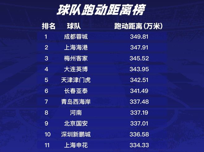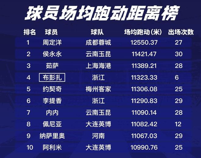 这个数据其实就是来自周定洋奠定的优势,他是上赛季中超场均跑动唯一一名超过12500米的球员,比第二名场均多跑超过1000米