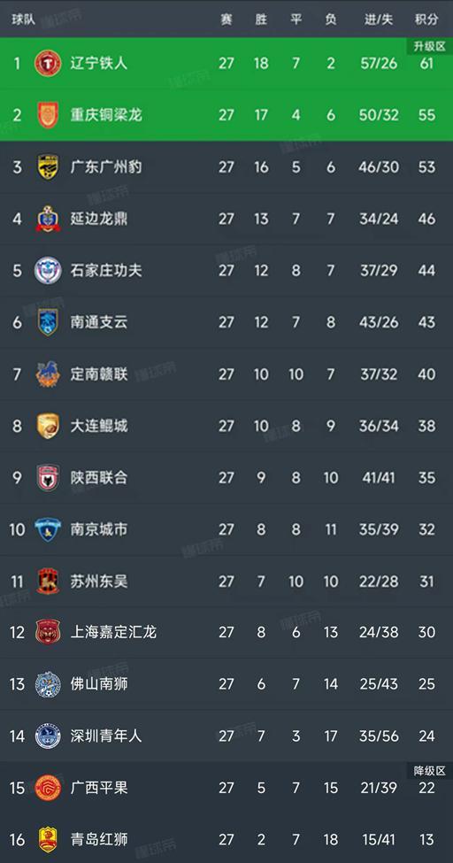 北京时间10月20日,中甲第27轮已经结束了所有的比赛,最新积分榜如下!