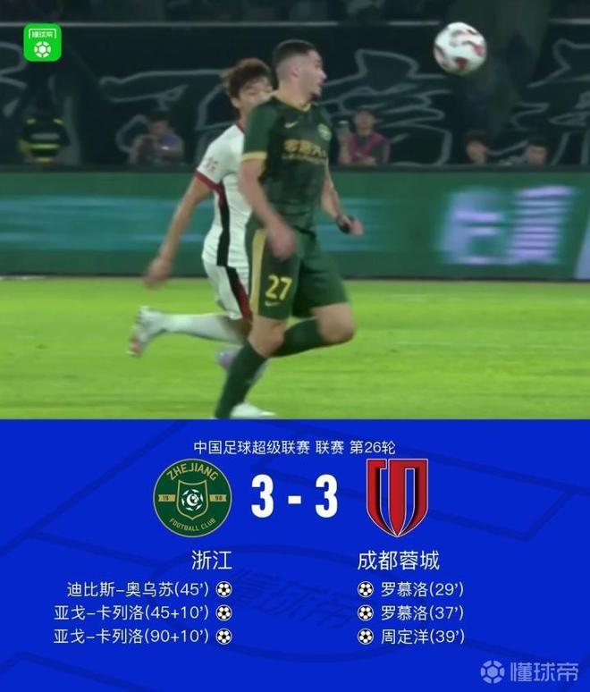 第二十六轮 浙江3-3成都蓉城 联赛争冠已经进入白热化,成都蓉城在本轮客战浙江上半场就取得了3-0领先,然而在随后的比赛中防守出现了问题,浙江外援卡列洛在伤停补时阶段完成绝平,成都蓉城就此让出了榜首的位置。